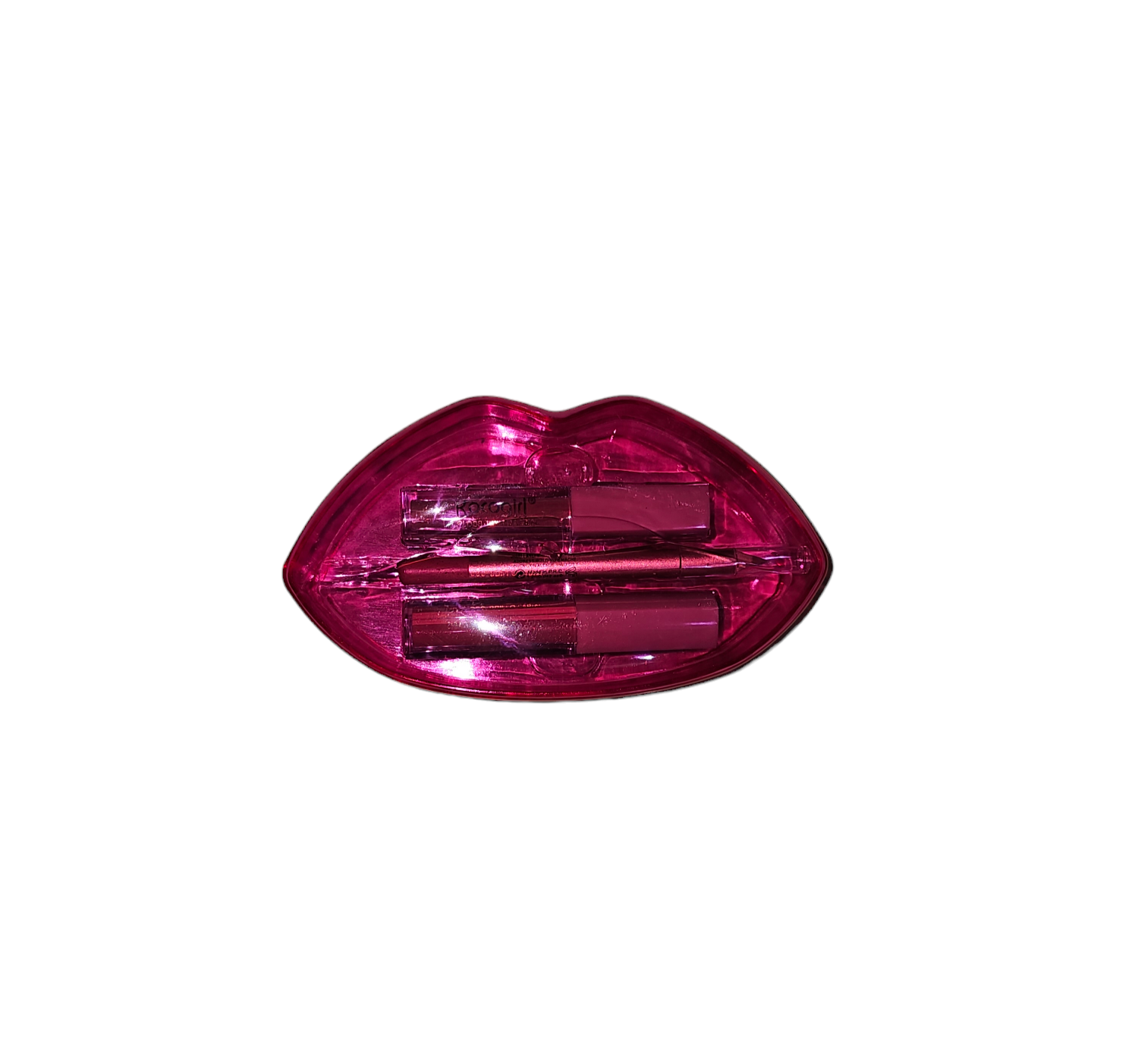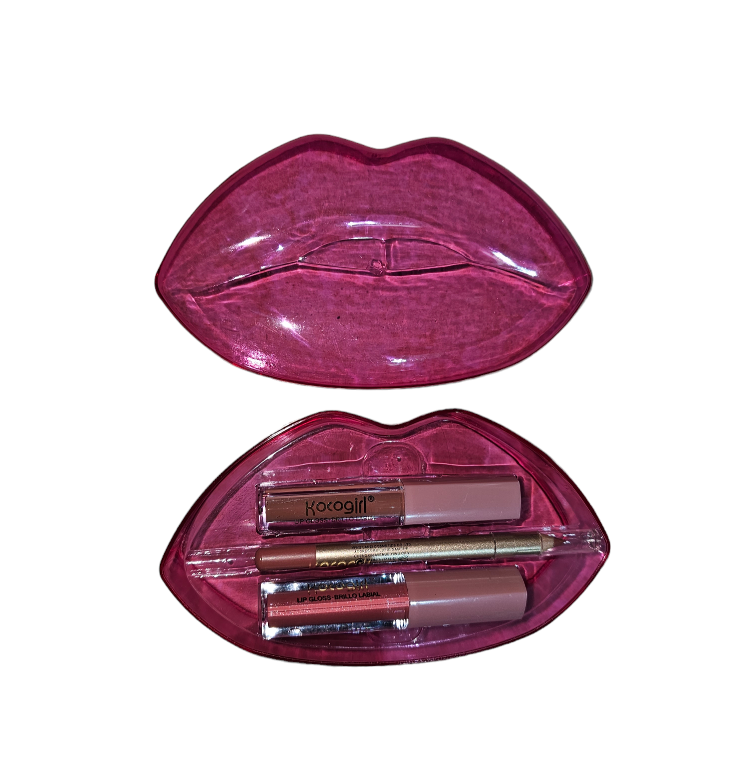 2 Lipgloss + 1 Matita labbra il tutto in una comodissima confezione a forma di labbra trasparente.