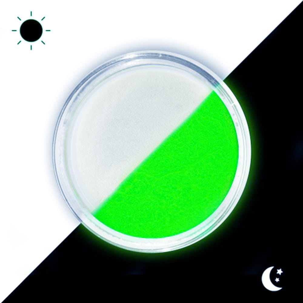 La polvere può essere applicata su qualsiasi colore, ma applicato a un colore simile a quello Lumino si illumina al buio, conquisterà inoltre l’effetto, rafforzerà e enfatizzerà la sua bellezza.