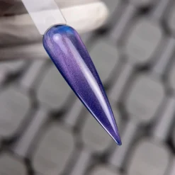 Lo smalto gel Saga Smoothie Cat Cat Eye è arricchito con piccole particelle metalliche. Quando esposto a un magnete, queste cambiano posizione, creando un effetto luce. Il magnete può essere posizionato ad angoli diversi per creare linee rette, raggi curvi, motivi astratti o transizioni morbide tra due tonalità.