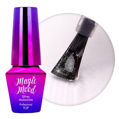 Magic Mood Top è un top lucido no wipe con particelle che, a diversi angoli di luce, luccicano nel colore del verde intenso e dell’argento.